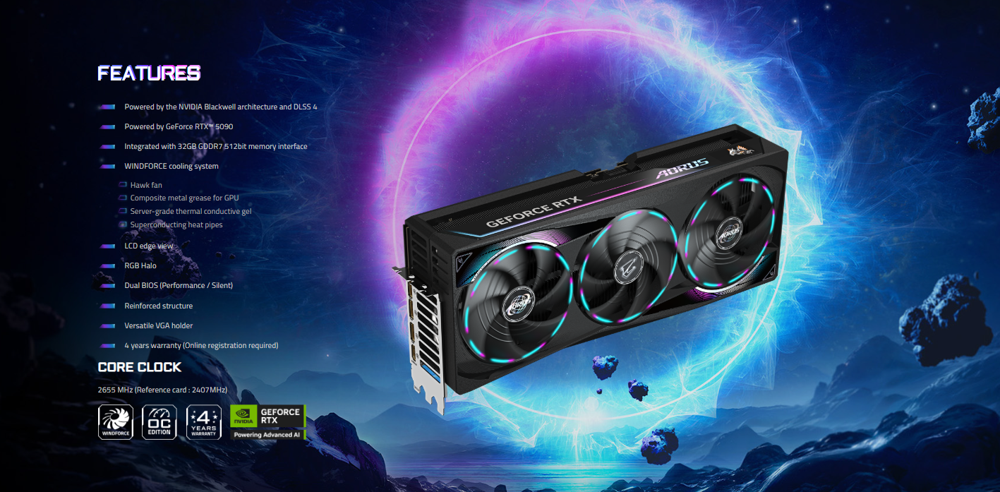 تُعد بطاقة AORUS GeForce RTX™ 5090 MASTER من Gigabyte تحفة هندسية ومحطة قوية لعشاق الألعاب والمحترفين، وهي مبنية على أحدث وأقوى تقنيات NVIDIA Blackwell Architecture لتقديم أعلى مستويات الأداء الرسومي التي لم يسبق لها مثيل.