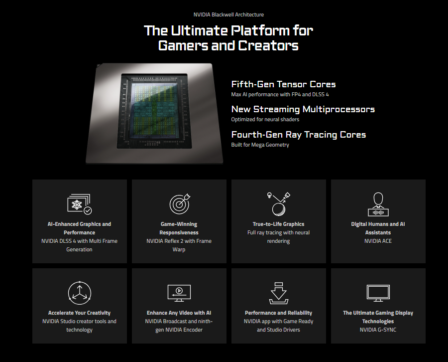 تدعم DLSS 4 (الجيل الرابع من تقنية التعلم العميق لأخذ العينات المتعددة) مع تقنية Multi Frame Generation لرسومات معززة بالذكاء الاصطناعي وأداء غير مسبوق.
