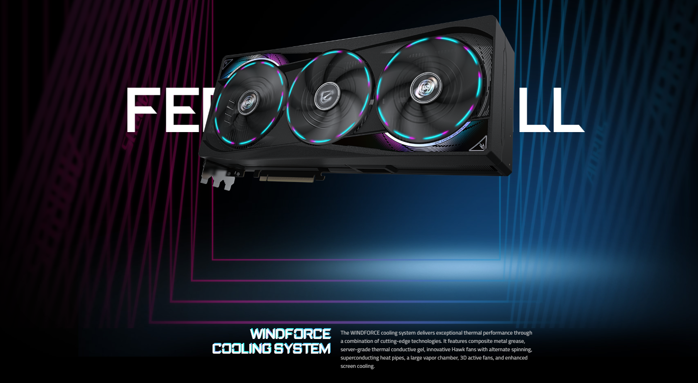 نظام تبريد WINDFORCE: نظام تبريد متقدم لتبديد الحرارة بكفاءة عالية، يشتمل على: