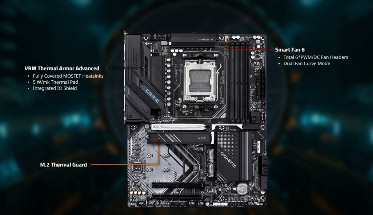 تدعم اللوحة أربع (4) فتحات DIMM لذاكرة DDR5 مزدوجة القناة (Dual Channel)، مع دعم خاص لوحدات الذاكرة التي تستخدم تقنية AMD EXPO™ لكسر سرعة سهل ومستقر للذاكرة. كما تم تزويد اللوحة بحلول تبريد فعالة، تشمل VRM Thermal Armor Advanced و M.2 Thermal Guard لتبديد الحرارة من منظمات الجهد وأقراص SSD.