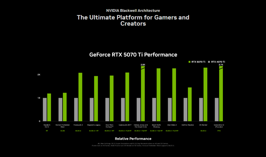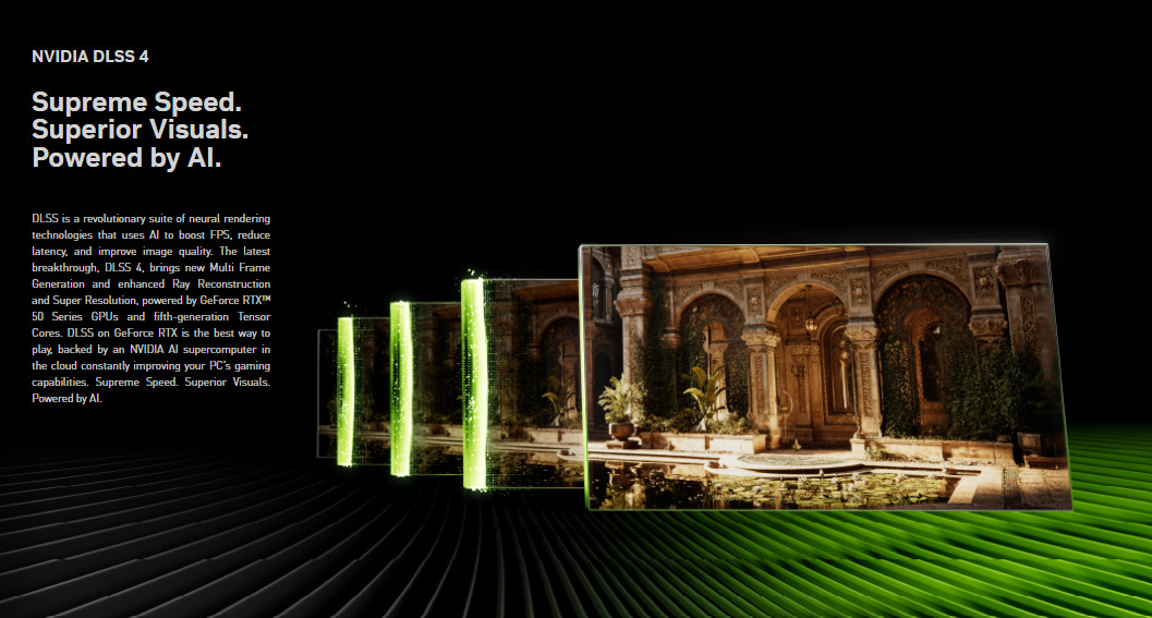 - تقنيات الذكاء الاصطناعي الرائدة (DLSS 4): ادخل إلى عالم من الأداء المعزز باستخدام NVIDIA DLSS 4، التي تستخدم تقنية توليد الإطارات (Frame Generation) و إعادة بناء الشعاع (Ray Reconstruction) المدعومة بالذكاء الاصطناعي، لزيادة معدلات الإطارات بشكل كبير مع الحفاظ على جودة صورة فائقة الوضوح.